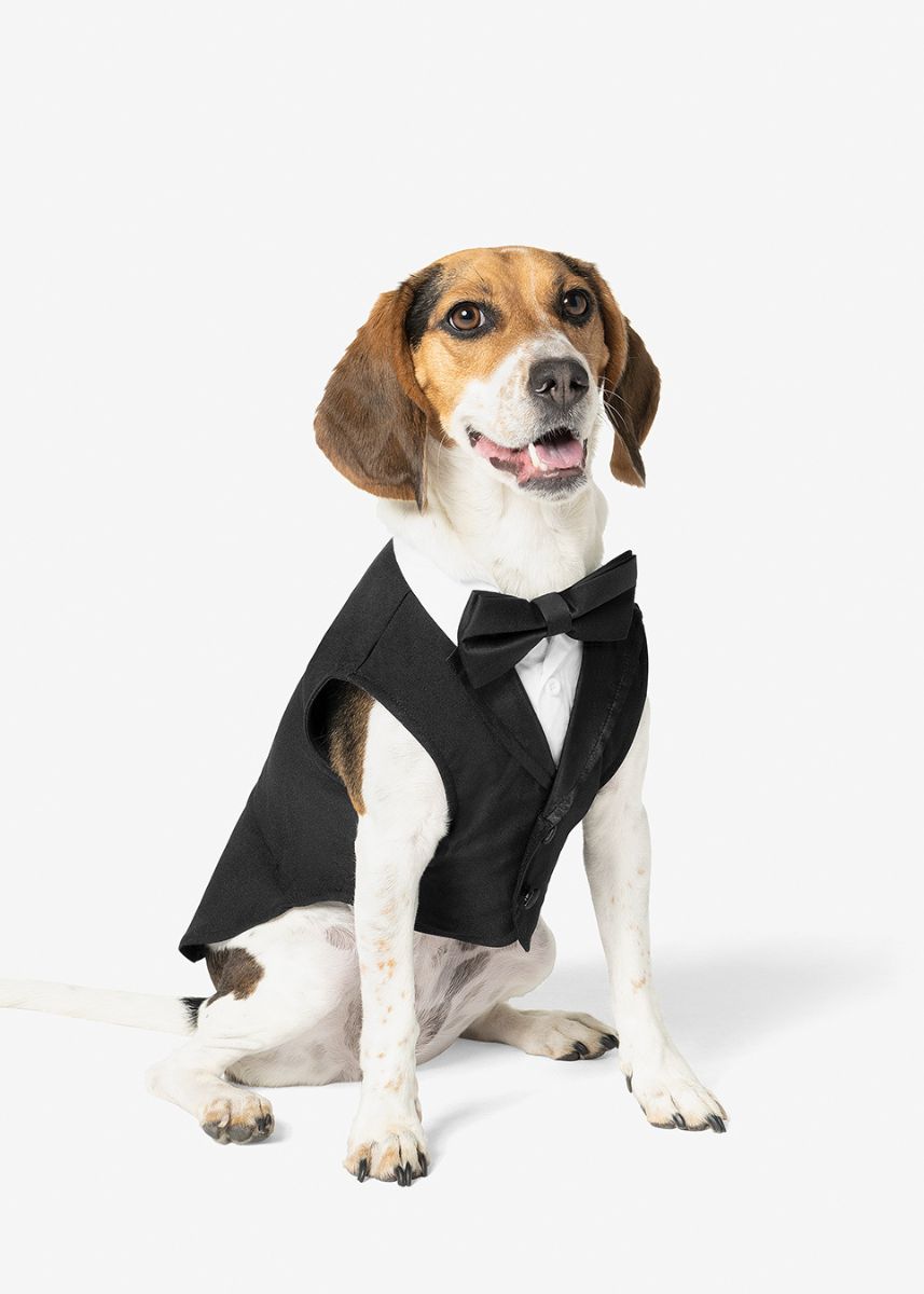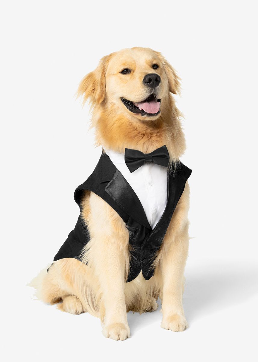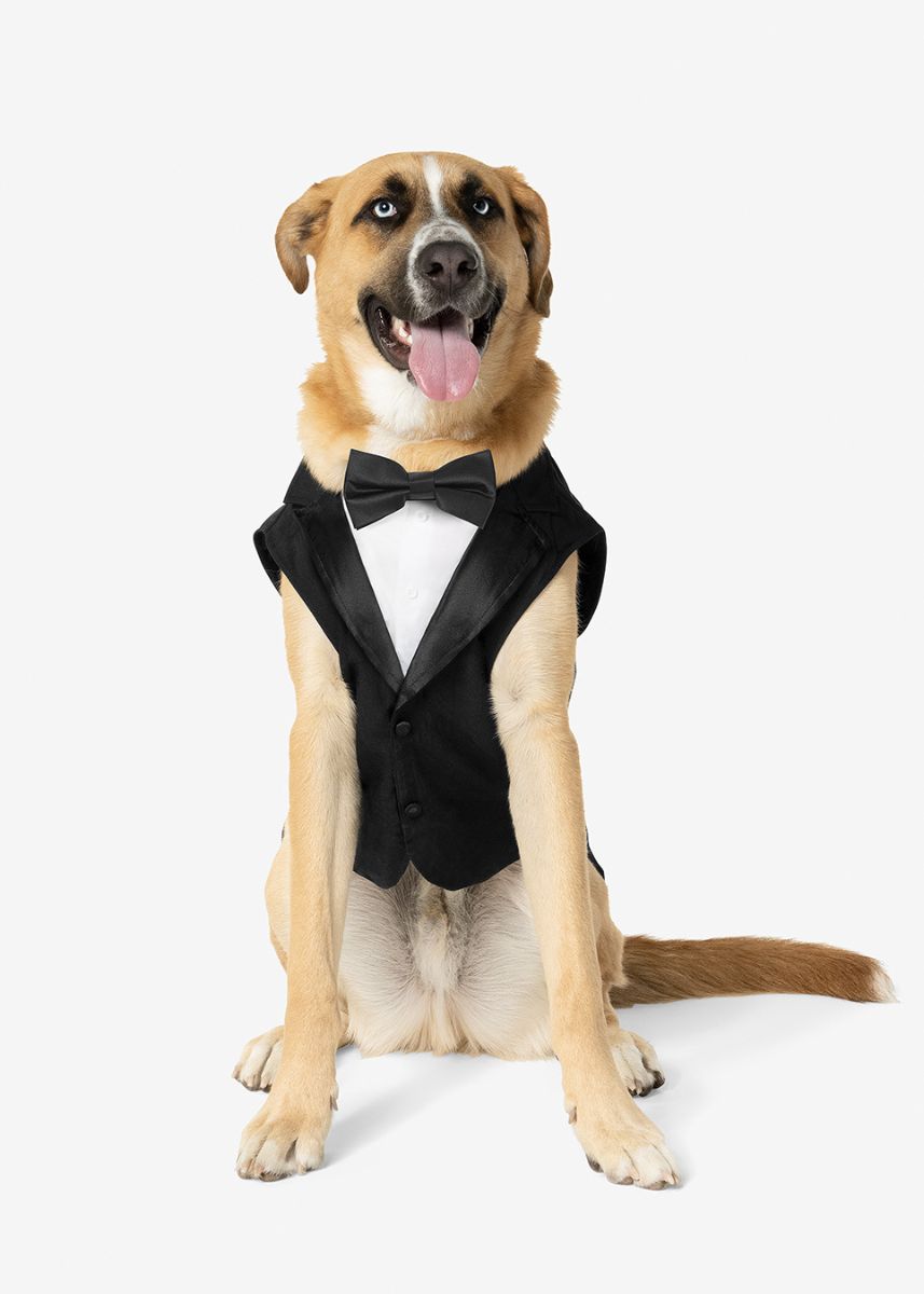 Dress up your pup in a classic black tuxedo. Top off your formal affair with a little fun and dress your family friend in a black tuxedo look made specially for dogs. Available in 5 sizes, and includes an elastic bow tie to complete the look. This dog tuxedo easily outfits your dog with velcro closures on the front chest, leaving them comfortable and free to enjoy your big day.