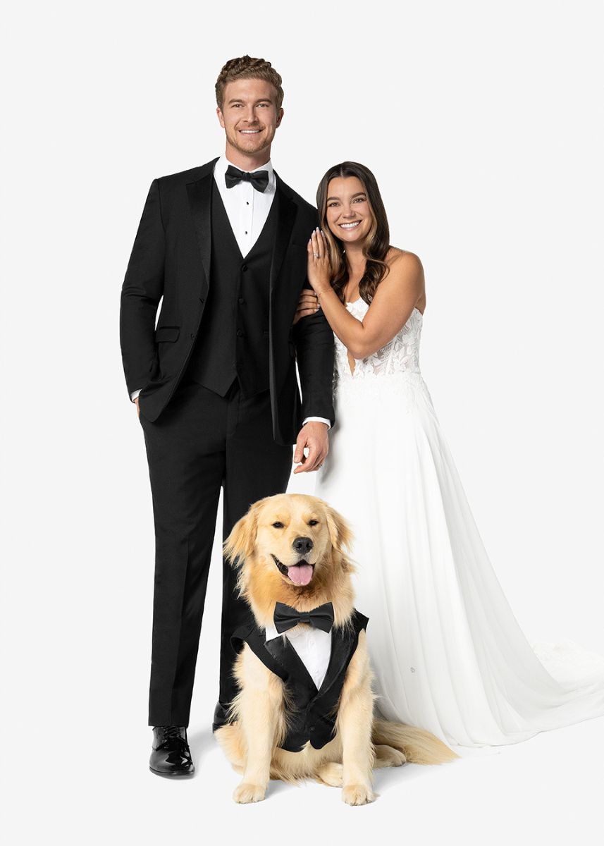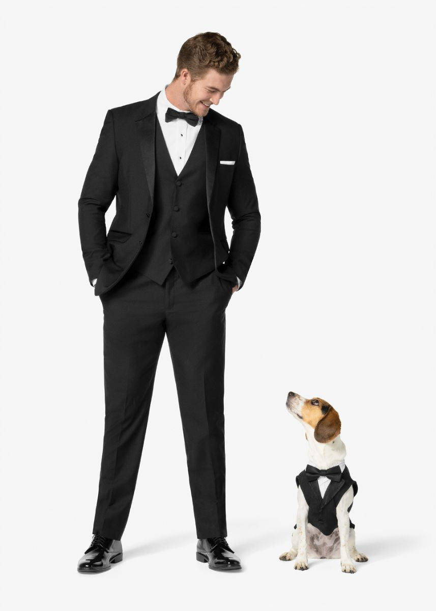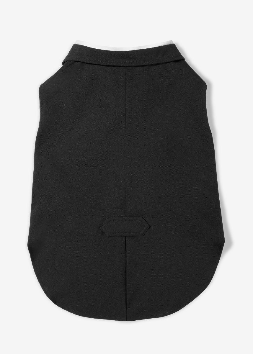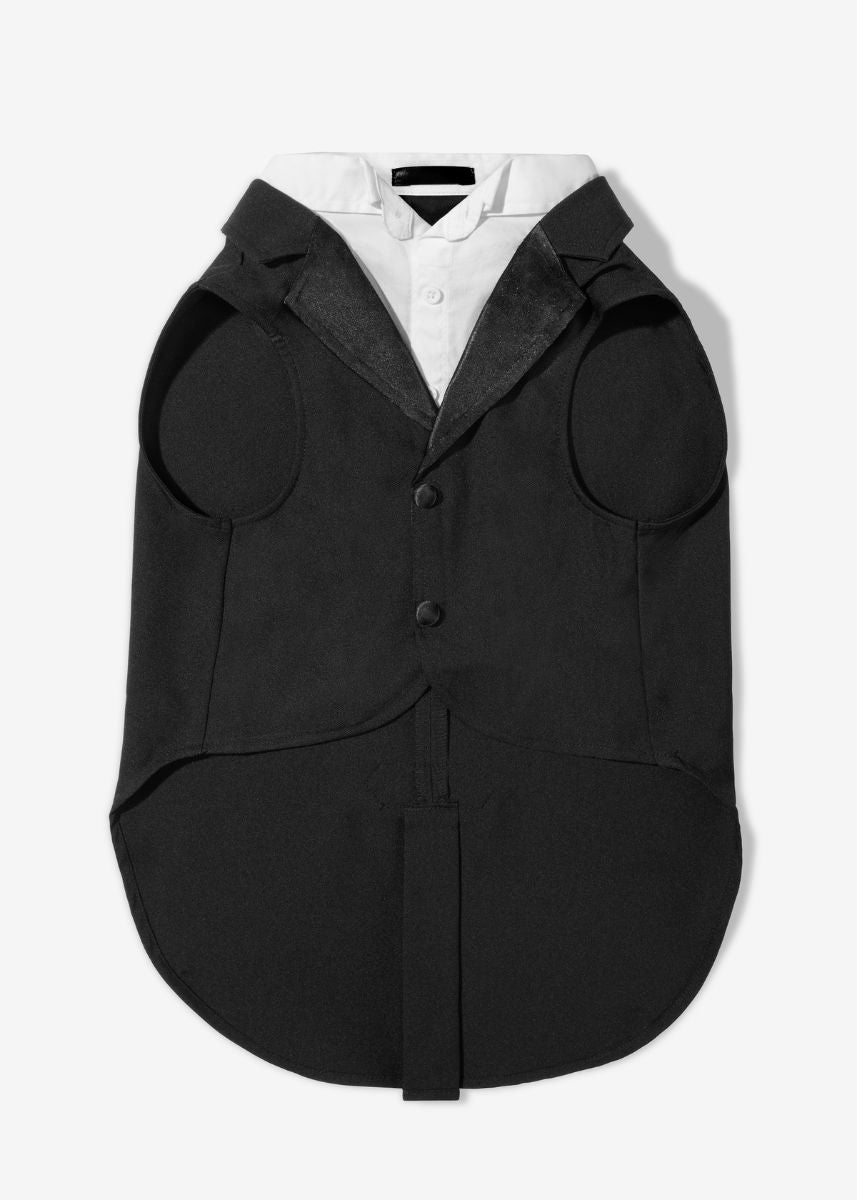 Dress up your pup in a classic black tuxedo. Top off your formal affair with a little fun and dress your family friend in a black tuxedo look made specially for dogs. Available in 5 sizes, and includes an elastic bow tie to complete the look. This dog tuxedo easily outfits your dog with velcro closures on the front chest, leaving them comfortable and free to enjoy your big day.