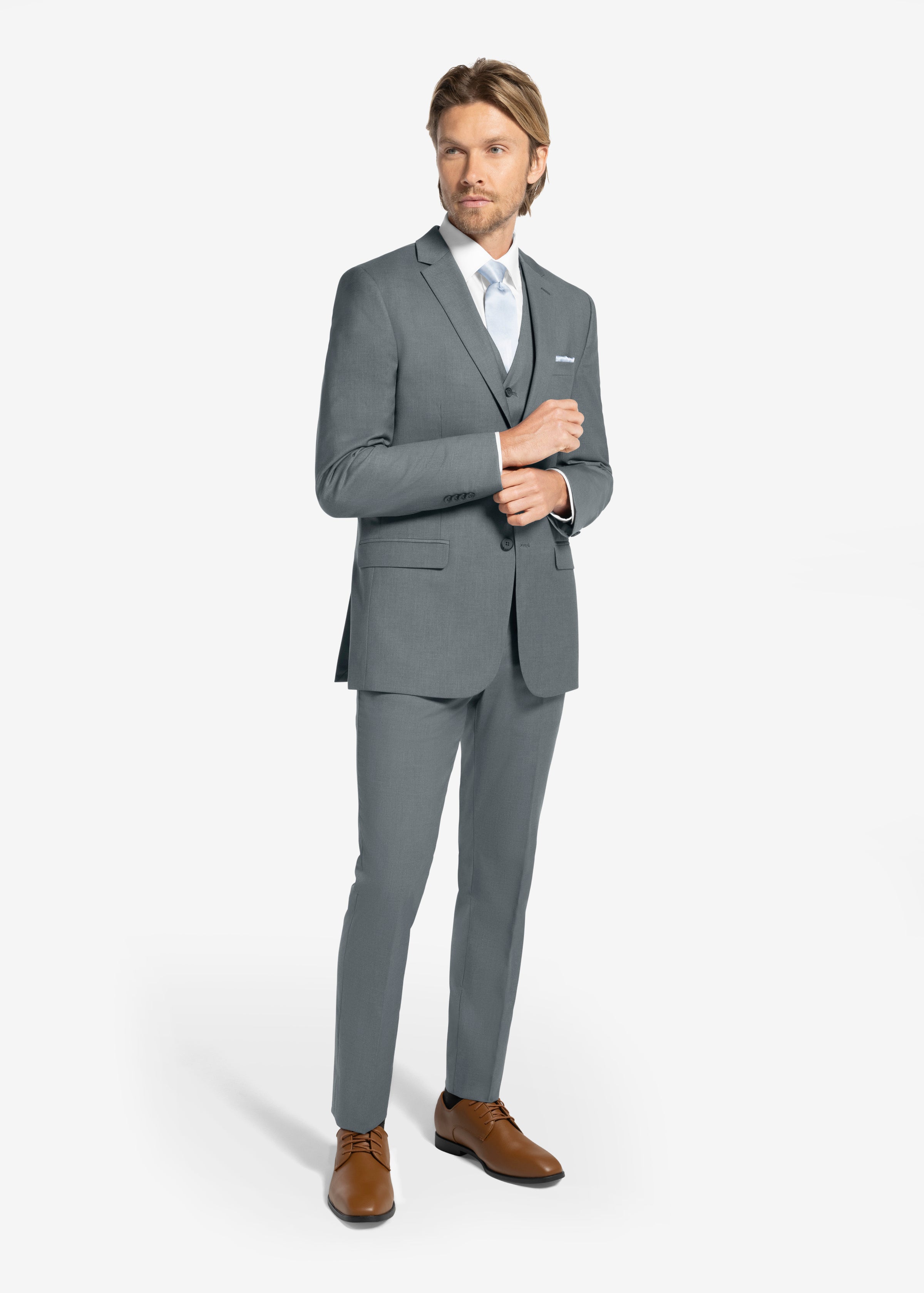 This elegant Gray Suit Jacket features a notch lapel and can be paired with a matching buttoned vest and pants for a three-piece look.